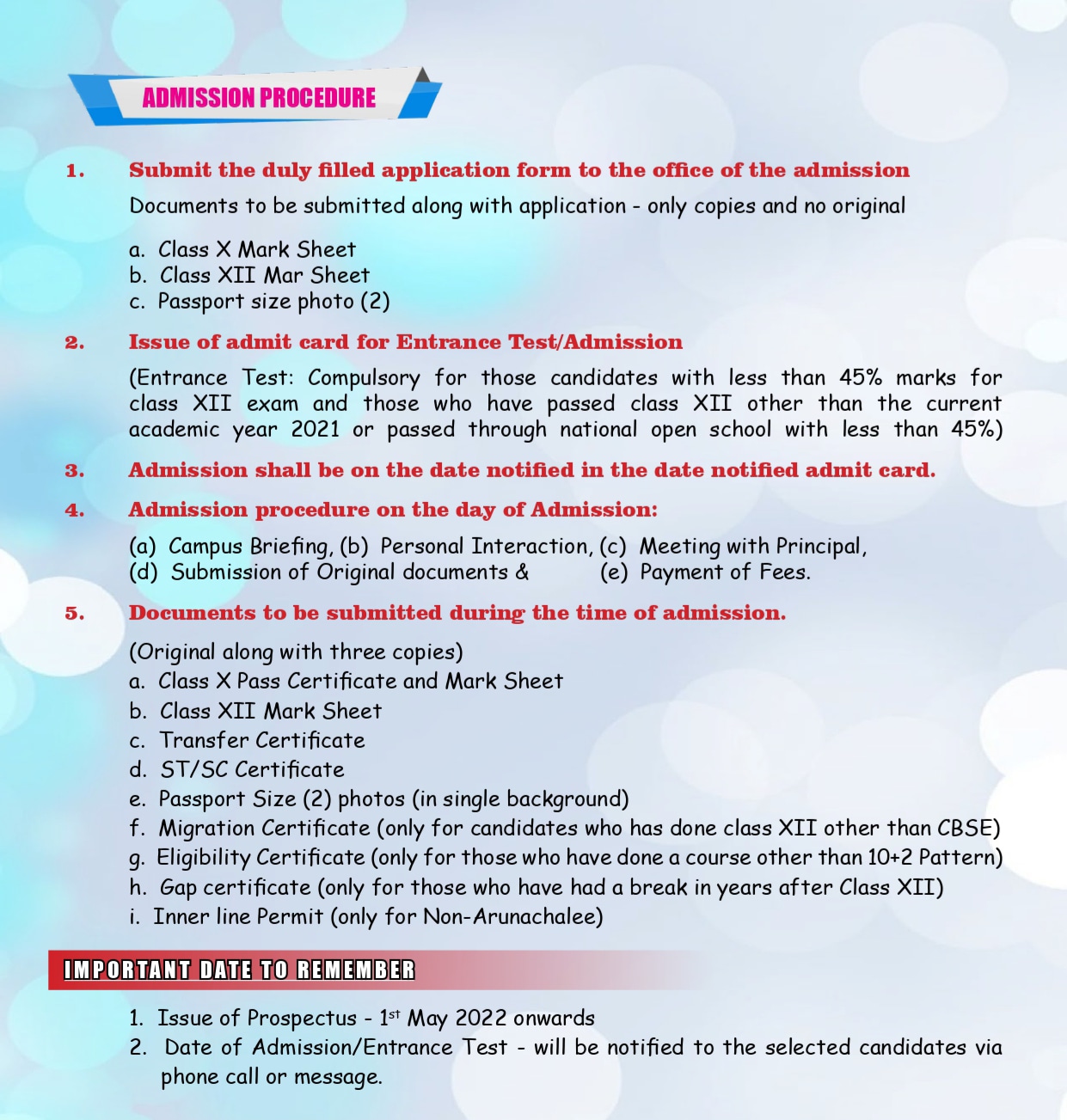 Once a candidate has gone through the process of selection, principal gives admission to the candidate based on the observation made by the admission committee at various stages of the admission process. To complete the process of admission, a candidate has to submit all the required original documents to the office and pay the college fee as prescribed. College fee is to be deposited in the bank within three working days after the completion of admission process.